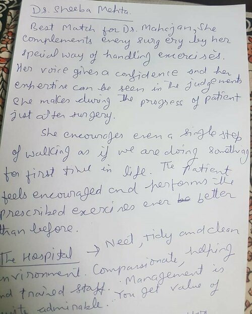 I was operated for Bilateral Total knee replacement. I got admitted on Jan 2nd 2019 and operated on 3rd Jan 2019 . First of all Doctor Mahajan is a fine person and after my knee replacement surgery , I am free from pain and comfortable. I thank him for that. My hospital stay in Dr. Mahajan's hospital was very comfortable. All staff members were very, kind and helpful. The hospital is well maintained and cent percent importance given for hygiene and cleanliness. My thanks to Dr. Sheeba, who was my physiotherapist. Good physiotherapist and a fine lady. She helped me in getting my day to day activities without any assistance. I am independent because of her skills and knowledge. First of all Doctor Mahajan is a fine person and after my knee replacement surgery , I am free from pain and comfortable. I thank him for that. My hospital stay in Dr.Mahajan's hospital was very comfortable. All staff members were very, kind and helpful. The hospital is well maintained and cent percent importance given for hygiene and cleanliness. My thanks to Dr. Sheeba, who was my physiotherapist. Good physiotherapist and a fine lady. She helped me in getting my day to day activities without any assistance. I am independent because of her skills and knowledge.